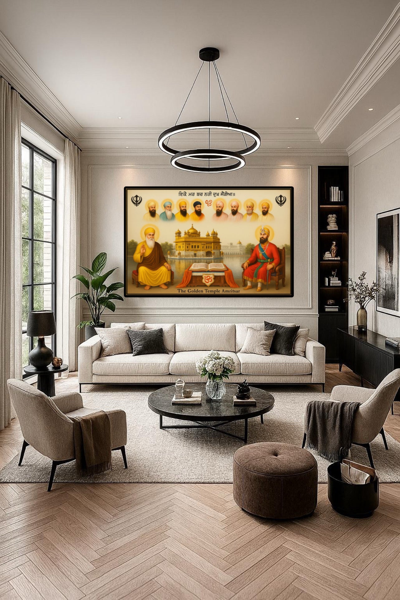 Sikhi Our 10 Gurus Guru Gobind Singh & Guru Nanak Dev Ji Sitting Together around Harmandir Sahib Temple Wall Art Poster